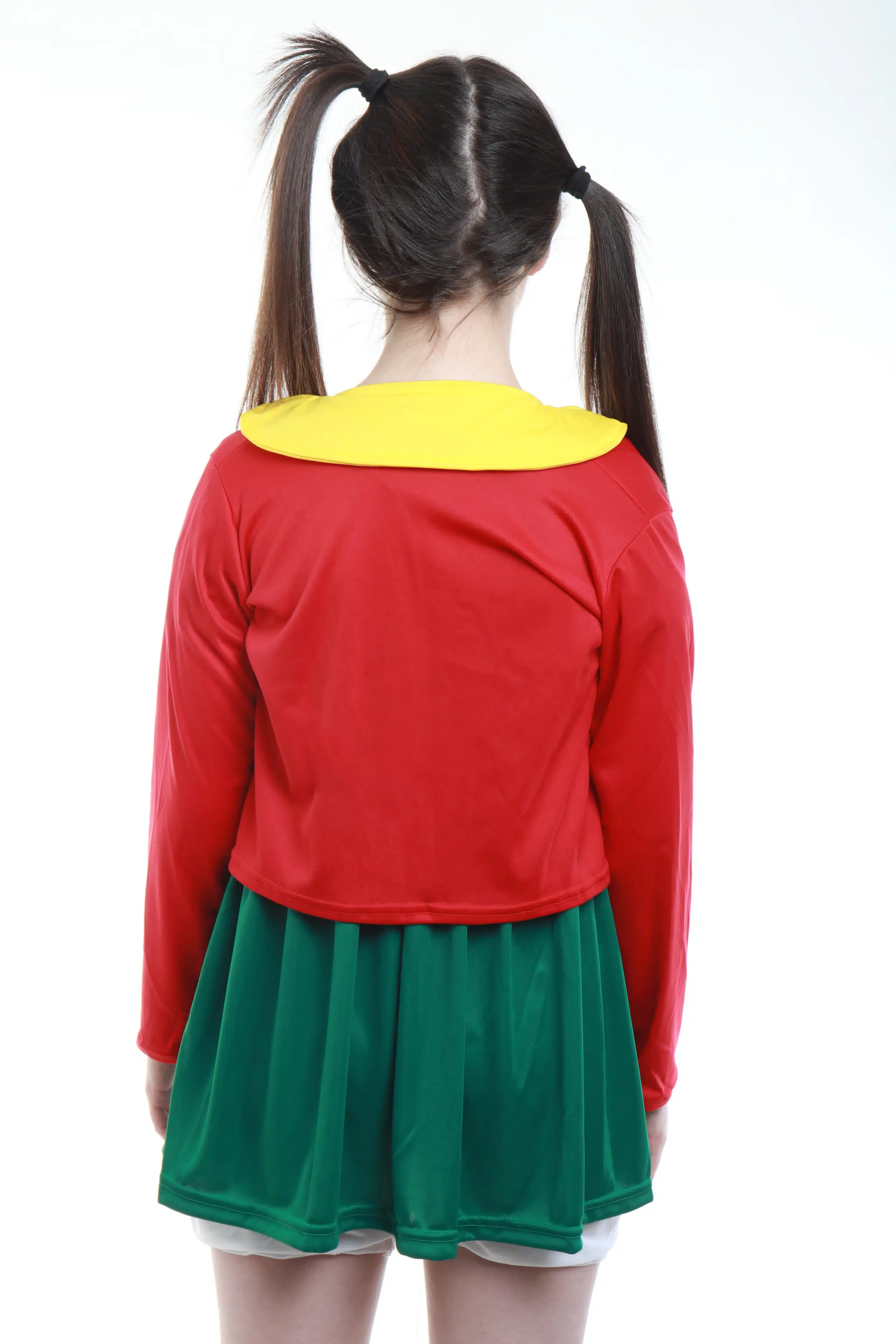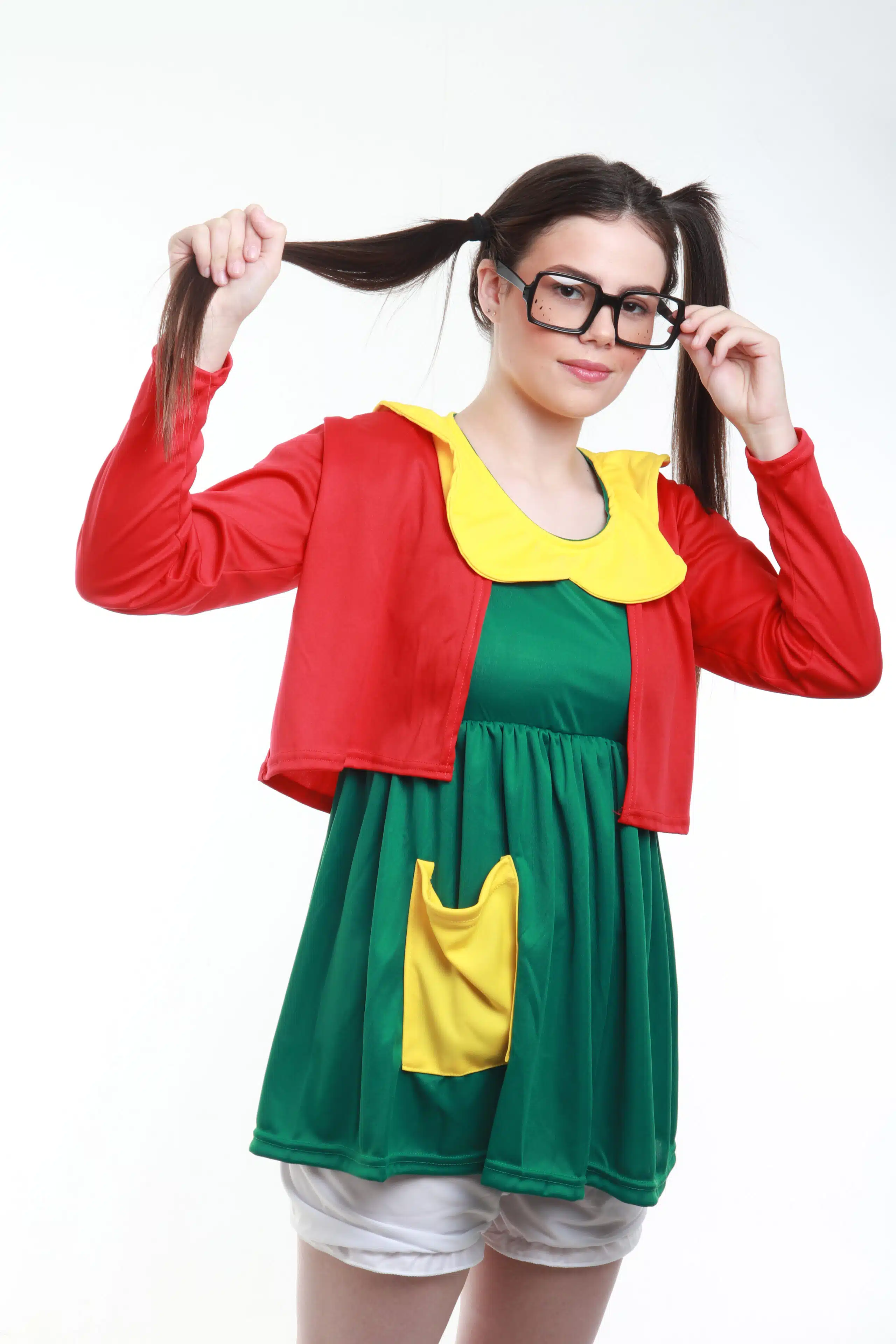 Vestido de helanca verde com detalhes amarelo, casaquinho vermelho em helanca, shorts em helanca branca e óculos.