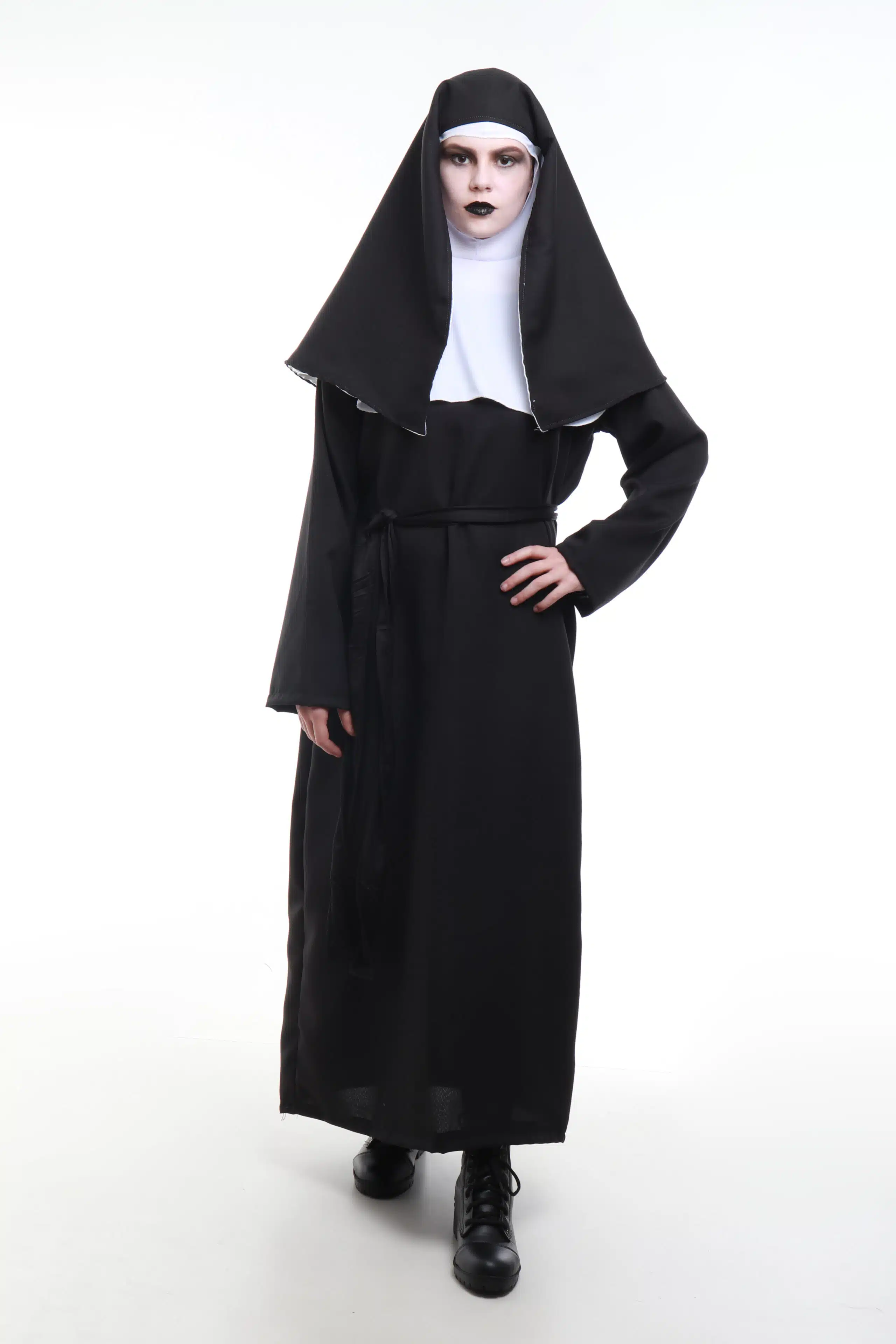 Fantasia de Freira Adulta é confeccionada em Oxford Preto, acompanha todos os acessórios de cabeça.