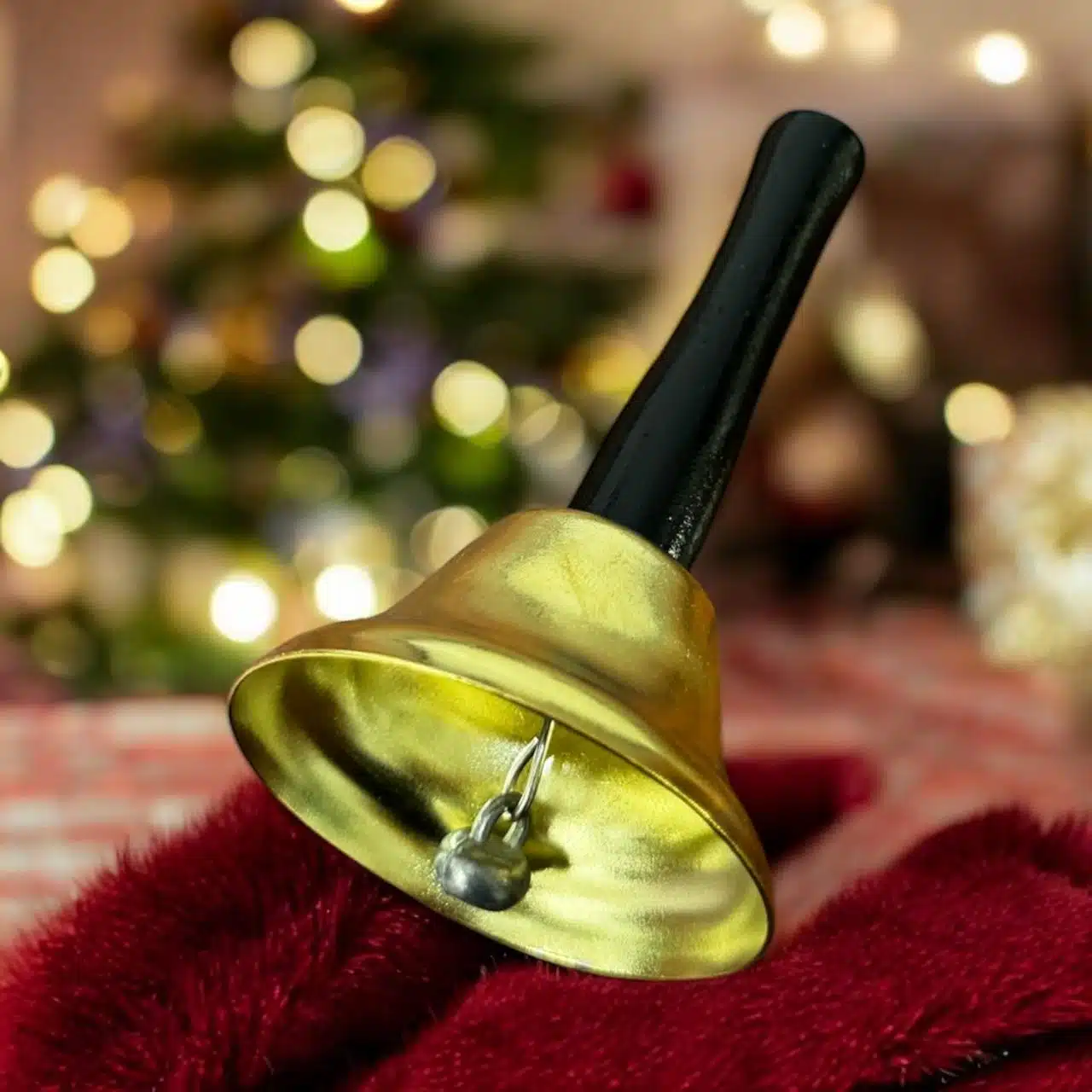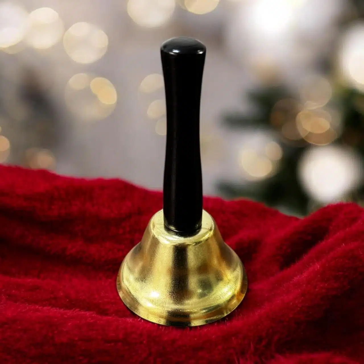 Sino em metal com cabo de madeira. Cor: Dourado/preto Composição: Metal e madeira Tamanho: 12cm x 7cm